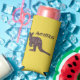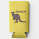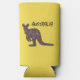 Seltzer can cooler features kangaroo silhouette in aboriginal mosaic pattern on yellow background with "Australia" in grunge style text