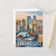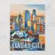 A vintage-style travel poster featuring the iconic Kansas City skyline. The image showcases the city's distinctive skyline ,The poster is designed in a retro style with a vibrant color palette and a nostalgic feel.