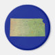 An elegant, detailed relief map of Kansas placed over a flag-color background.