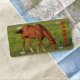 A shot of a Red Colorful Horse in a green pasture eating green grass that's bright and colorful.