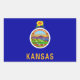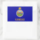 The official flag of Kansas consists of a dark blue rectangle arranged horizontally with the state seal aligned in the center. The state name "KANSAS" is printed below the seal. Above the seal is a sunflower sitting over a gold and light blue bar. The state seal tells the history of Kansas and pioneer life. The thirty-four stars clustered at the top of the seal signify that Kansas was the 34th state to be accepted into the Union of the United States.