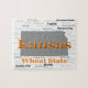 Kansas state pride image including map silhouette with cities, towns and motto.