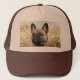 Hübsche Französische Bulldogge hat es sich in einem Strohballen gemütlich gemacht.