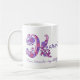 Decorated hand drawn letter with your own name beginning with K and name meaning mug. Pretty heart and flower capital K doodled typographic design featuring hearts and flowers and the words Karen Pure, charismatic a dependable friend in pink and purple. © Unique art and design by Sarah Trett. www.sarahtrett.com for www.mylittleeden.com on zazzle