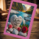 A white heart-shaped stone with the name Karen inscribed on it sits on river rocks near a flowing river and a sunset.