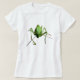 This shirt features a lively katydid. Katydids are medium-sized to large insects. They are usually green, sometimes with brown markings, and are camouflaged to blend with the leaves they feed on. Their very long antennae distinguish them from grasshoppers. Seen up close, they seem to be aliens from outer space!