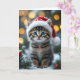 Dieses liebevolle Design zeigt ein niedliches Kätzchen mit strahlend blauen Augen, das eine rote Weihnachtsmütze trägt und von warmen Lichtreflexen umgeben ist. Der unscharfe Lichterhintergrund und winterliche Details erzeugen eine besonders gemütliche und herzliche Weihnachtsstimmung.