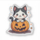Adorable kawaii black and white kitten in chibi style with Halloween pumpkins and spooky tones. Perfect for seasonal stickers and gifts.