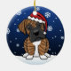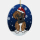Cute Brindle Boxer Christmas Ornament, drawn in kawaii cartoon! This adorable dog breed is wearing a red Santa hat, and snowflakes are falling all around him. Absolutely adorable, perfect for the dog lover's Xmas tree!