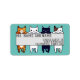 Four cute cats hanging out on a sign that has your address details: a tiger striped cat, a white one, a black one, and a calico cat hanging, throwing shade!