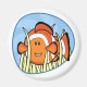 A cartoon kawaii clownfish is swimming through an anemone, against a blue background. Very cute clownfish gifts!