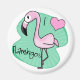 Tropical kawaii flamingo in front of a sea green background! Text reads, I Love Flamingos. Super cute pink flamingo gifts featuring our cartoon bird.