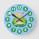 Kawaii cartoon of a frog with sparkling eyes and a crown on its head. The frog prince is sitting on a lily pad in the pond looking upwards with a heart around its head. The clock face numbers are uniquely placed on lily pads to tie in with the whole theme. This adorable and colorful design makes it attractive for kids. Designed by Rusty Doodle.