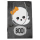 Cute Halloween gift bag featuring a smiling ghost with rosy cheeks, an orange bow, and “Boo!” text on a dark background. Perfect for kids’ Halloween party favors, classroom treats, or handing out candy on trick-or-treat night. A fun and family-friendly design for Halloween.