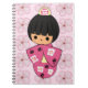 Cute notebook featuring a kokeshi doll in a pink kimono with a cute yellow hat on a cherry blossom background. A fun combination of Japanese traditional art and flirty kawaii style.
