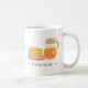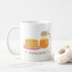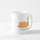 A couple mug design that features a stack of pancakes on a plate with drizzle of maple syrup and slice of butter pairing with a container of maple syrup with maple leave label. The text reads "We belong together!" with two hearts.