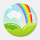 a colorful illustration of a cute rainbow and cloud over a green grass landscape.
