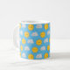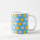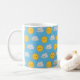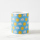 Repeat pattern of happy suns and sad rain clouds on a blue sky background for changeable springtime weather.