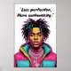 Vibrant pop-art style poster featuring Kay Flock with the quote “Less perfection, more authenticity.” Designed with bold colors, sharp vector details, and a modern hip hop aesthetic that celebrates confidence and being real.