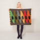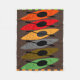 Kayaker Fleece Blanket, artist drawn kayaks in earth tone colors of orange, red, grey, brown and green on a dark brown background. Perfect gift for anyone who loves kayaking.