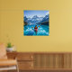 Poster with an illustration of a man kayaking in the ocean by the snow topped mountains. Pretty serene blue tranquil water and pine trees surround him on a peaceful journey.