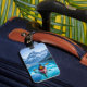 Luggage tag with an illustration of a man kayaking in the ocean by the snow topped mountains. Pretty serene blue tranquil water and pine trees surround him on a peaceful journey.