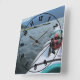 This wall clock is adorned with a lively outdoor sports theme, showcasing a kayak navigating the dark, undulating waves of the ocean, with additional kayaks scattered in the distance and mountains rising in the backdrop.