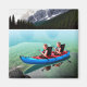Two people kayaking on beautiful turquoise lake surrounded by snow capped mountains and beautiful trees.