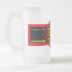 Frosted Glass Beer Mug white with red, gold and white concentric-circles design above a black and gold rectangle with "KANSAS CITY, MISSOURI CENTER OF THE UNIIVERSE" "GOOOOOOO CHIEEEFS!!!" with The State Seal of Missouri in the center. This design is a shout-out to Kansas City, Missouri a city of champions.
