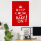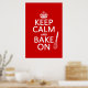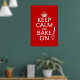 This reads Keep Calm and Bake On, in the style of the classic keep calm poster. There is a balloon whisk next to the words. It's a beautiful stylish design, which makes a wonderful range of products for anyone who loves to bake. Also great promotional materials for bakers, bakeries, cafes, and more.