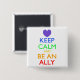 Celebrate pride with this fun design that spoofs the famous British propaganda phrase, which here reads "Keep Calm and Be An Ally" in the same poster-style all capital font. The words are in rainbow colors and the crown icon has been replaced by a purple heart. This is made for everyone who knows that love is love.