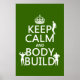 This design reads 'Keep Calm and Body Build', with the traditional crown at the top. There are three body builder figures standing on or by the words. It's a fun design which makes a great gifts for body builders. Available on posters, t-shirts, post cards and business cards, as well as many other products.