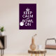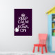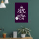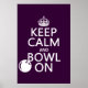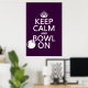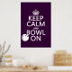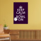This reads 'Keep Calm and Bowl On' in the style of the original Keep Calm posters. There is a silhouette of a bowling ball beside the words. It's a clean fun design perfect for anyone who loves to bowl.
