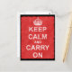 This popular WWII propaganda poster slogan says, "Keep Calm and Carry On." Here, it's given a vintage, antique look through the use of distressed text and a worn, tattered red grunge background. This is a trendy postcard for anyone who loves history and is looking for a classic motivational, inspirational saying.