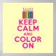Keep calm and color on. Relax by coloring with crayons, color pencils, and pastels. Pink keep calm font over a light yellow background with a set of colored pencils at the top. Perfect look for art teachers and elementary teachers who love coloring inside and outside the lines.