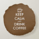 Brown keep calm and drink coffee round throw pillow. Personalizable template for making your own funny keep calm and carry on parody. Vintage keepcalm typography with little pixelated coffee cup. Create your own keepcalmandcarryon spoof. Funny cafe decor for sofa couch or chair. Customizable color / colour. Double sided design.