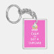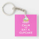 Keep Calm and Eat a Cupcake. Cupcakes will make you happy. A cupcake with jelly beans in a fluted paper cup. Classic white Keep Calm font over a pink background.