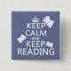 This is the classic war poster "Keep Calm and Carry On" reworded to "Keep Calm and Keep Reading". It's written in white on a coloured background and is accompanied by the silhouettes of three falling books.