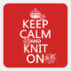 This reads Keep Calm and Knit On, in the style of the classic keep calm poster. There are balls of yarn and knitting needles nestling among the words. It's a beautiful design, which will please anyone who loves to knit. It makes a great range of presents for knitters, and home furnishings for crafting / sewing rooms.