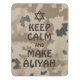 Text reading "KEEP CALM AND MAKE ALIYAH" superimposed on a desert camouflage background.