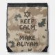 Text reading "KEEP CALM AND MAKE ALIYAH" superimposed on a desert camouflage background.