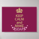 great gift for anyone who loves to handmake their own soaps! Something to hang in their workspace. Design features a royal crown, atop the phrase 'Keep calm and Make soap' with soap bubbles!