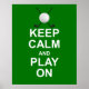 This is a poster suitable for a golfer. It has a white golf ball over crossed golf clubs on a green background. It states Keep Calm and Play On which could be hard to do when you can't find your golf ball. This would look great in your home, dorm room or office. Add some text to personalize it.