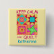 Show off your love of quilting with this fun and colorful name badge pin tag in meetings or gatherings. The art features four block quilt design proclaiming "Keep Calm and Quilt". This design is original quilt art with favorite patchwork quilt blocks plus unique blocks. The word "quilt" is easy to change to another word of your choice. The quilt design is in vibrant and dynamic colors of orange, yellow, pink, turquoise, and lime green for a beautiful color palette. Fully customizable to personalize. Quilt art is original art from fabric and quilt designer Phyllis Dobbs. This art is available on other products and in several color backgrounds and is also available on more Keep Calm products with different quilt art. More products are a;sp available in Phyllis' BusinessWithFlair store.