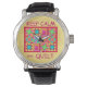 Show off your love of quilting with this fun and colorful quilt block wrist watch proclaiming "Keep Calm and Quilt". This design is original quilt art and favorite patchwork quilt blocks plus unique blocks including log cabin, pinwheel, star, and square in a square blocks. The word "quilt" is easy to change to another word of your choice. The quilt design is in vibrant and dynamic colors of orange, yellow, pink, turquoise, and lime green for a beautiful color palette. Fully customizable to personalize. Quilt art is original art from fabric and quilt designer Phyllis Dobbs. This art is available on other products and in several color backgrounds and is also available on more Keep Calm products with different quilt art. More products are available in Phyllis' BusinessWithFlair store.