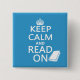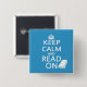 This is the classic "Keep Calm and Carry On" war poster, reworded to "Keep Calm and Read On". It's written in white on coloured background, and is accompanied by a silhouette of a book to one side.