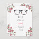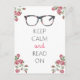 Pink roses on the four coners illustrate this white background with a lovely reading glasses in dark floral pattern. Under it is written Keep calmand Read on.
