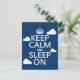 This reads Keep Calm and Sleep On, in the style of the classic keep calm poster. There are clouds floating past the words. It's a popular, calming design, perfect design for the bedroom, or for anyone involved in sleep therapy.