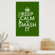 This reads Keep Calm and Smash It, in the style of the classic keep calm poster. There is a tennis racket upon the words. It's a popular design with tennis coaches, tennis players and tennis fans.
