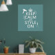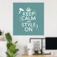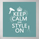 This reads Keep Calm and Style On, in the style of the classic keep calm poster. There are frills and spirals on the letters, and silhouettes of scissors and a hairdryer. This is a popular design with people in all aspects of the beauty industry, and makes great gifts too.